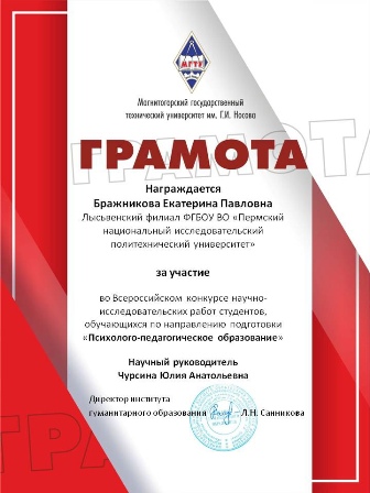 Студентка группы ППД-20-1б, Бражникова Екатерина, приняла участие во Всероссийском конкурсе научно-исследовательских работ студентов, обучающихся по направлениям подготовки «Психолого-педагогическое образование». Научным руководителем работы является доцент кафедры ОНД, кандидат экономических наук, Чурсина Ю.А.